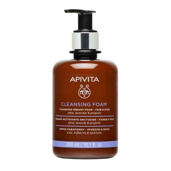 The Apivita Cleansing Foam Face & Eyes Olive & Lavender is a creamy foam that gently cleanses the face and eyes from impurities and makeup without irritating or dehydrating the skin.