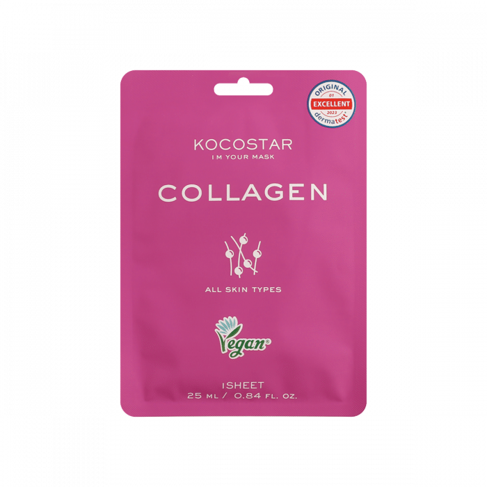 Revitalizing sheet mask with plant-based collagen and botanical extracts to hydrate and restore skin elasticity. Suitable for all skin types.